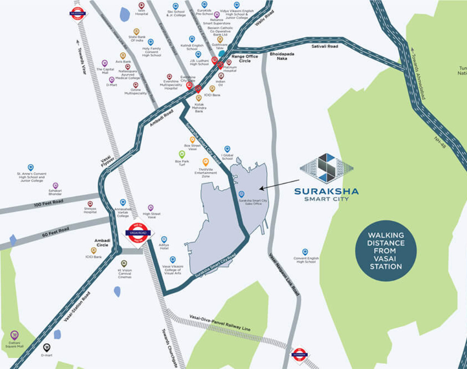 Suraksha Smart City is located in Vasai in a residential area with access to daily needs, schools, and transport connectivity.